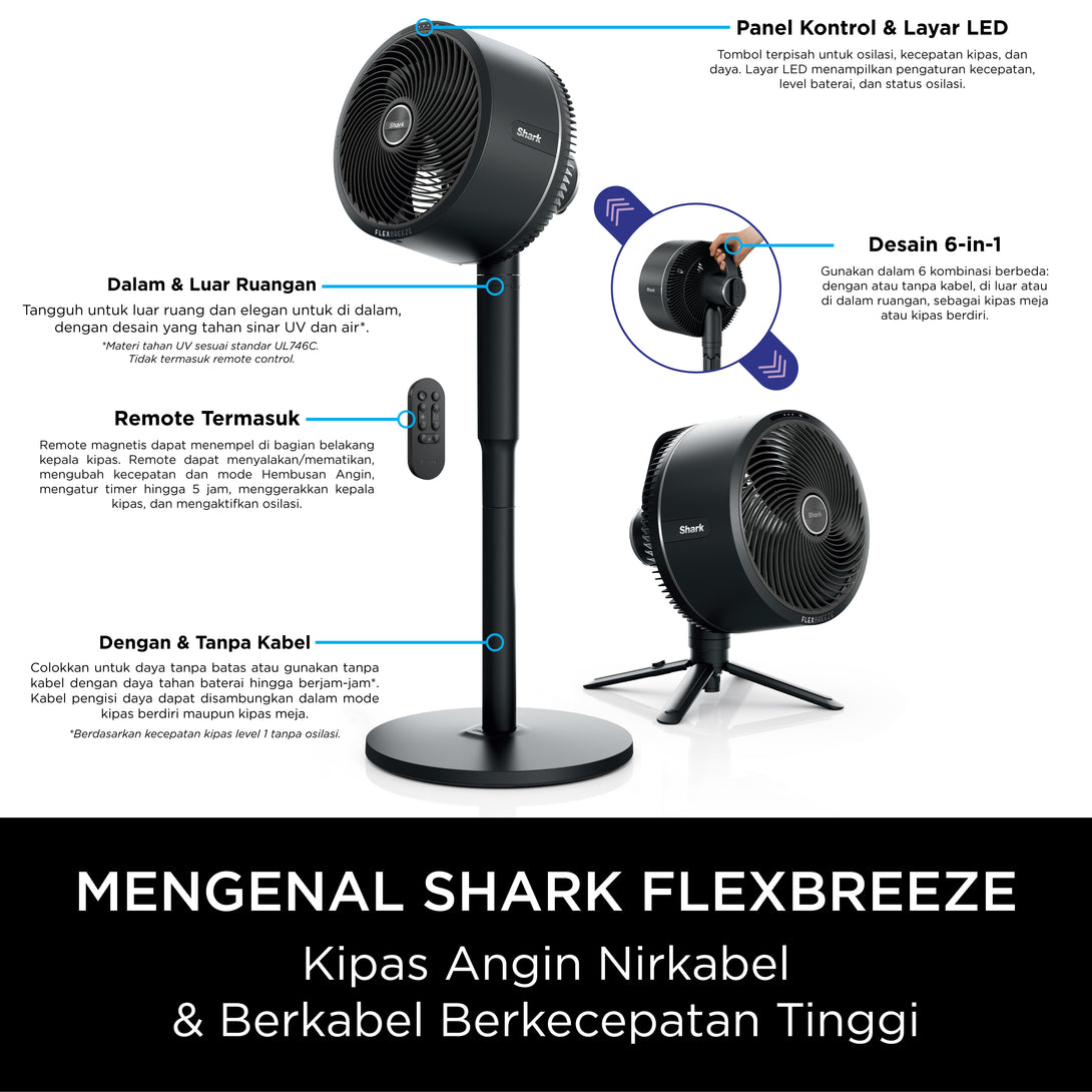 Perkenalkan Shark FlexBreeze Fan, kipas angin revolusioner yang menawarkan kekuatan luar biasa dan adaptabilitas tinggi. Dirancang untuk efisiensi maksimal, kipas ini mampu bertransformasi secara instan dari mode pedestal (berdiri) menjadi mode tabletop (meja) hanya dalam hitungan detik. Fleksibilitasnya diperluas dengan kemampuan penggunaan berkabel maupun nirkabel, serta kesesuaian untuk area indoor maupun area outdoor, menjadikannya perangkat grab-and-go yang ideal untuk mobilitas tinggi. Dengan performa unggul, hembusan anginnya dapat menjangkau jarak hingga 20 meter dan didukung oleh ketahanan baterai hingga 24 jam*, memastikan kenyamanan pendinginan yang optimal di mana pun Anda berada.